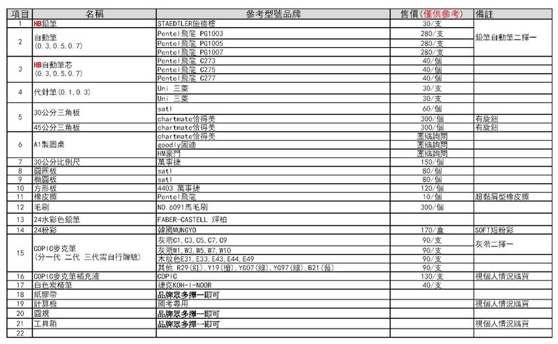 | 16 | 繪圖板(製圖板) | | 可以去搜尋goodly或是洽德美這牌子的製圖桌,算是製圖桌的名牌。現在製圖桌一定要自己帶。可以買鋼索式的,也可以買滑軌式的。觀看個人的需求 |